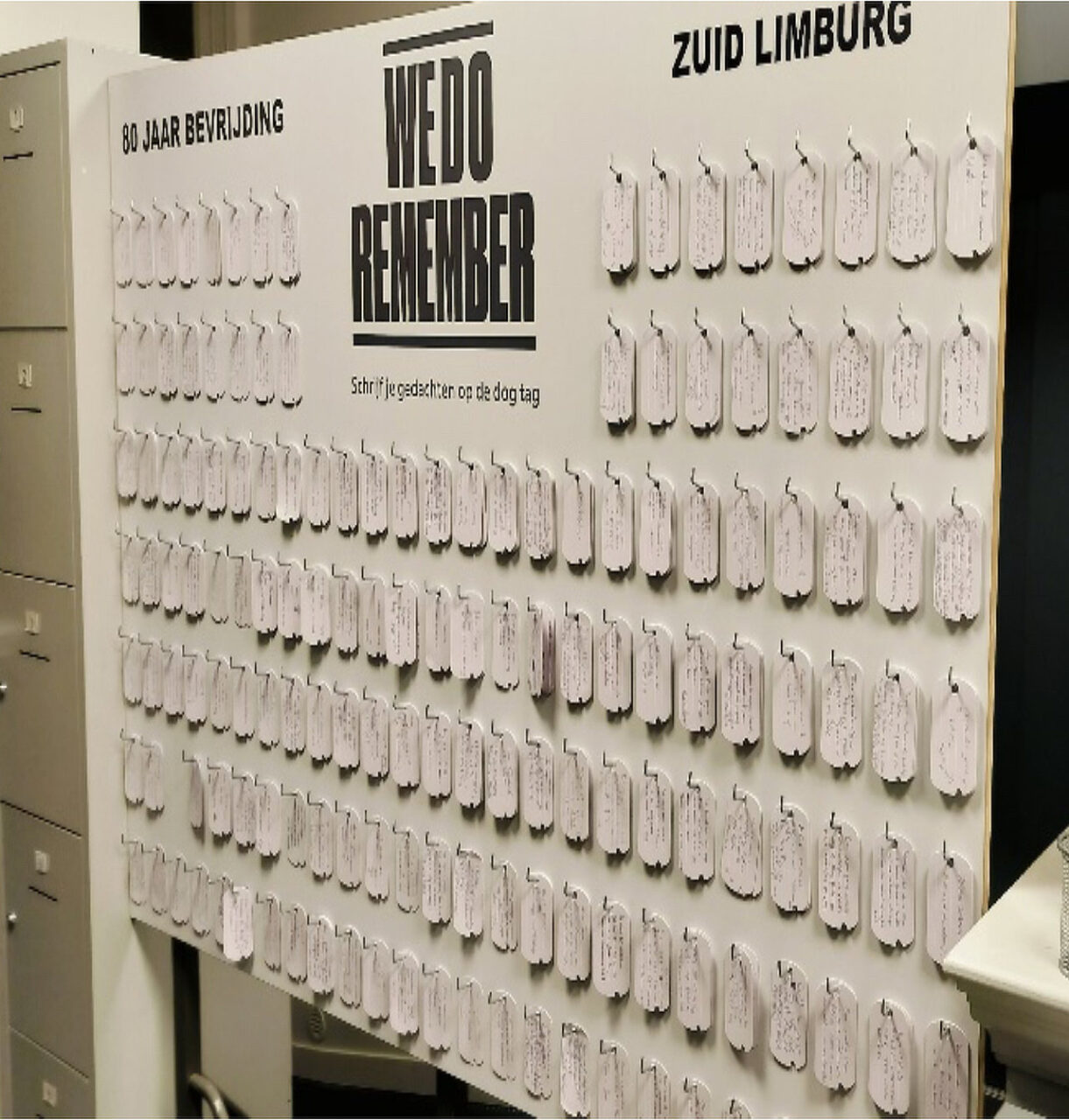 In de hal van het museum staat een bord met kaartjes. De bezoekers kunnen hun emoties en ervaringen op kleine kaartjes schrijven zodat andere bezoekers ze kunnen lezen, wat een gevoel van verbondenheid en gedeelde ervaringen kan oproepen.