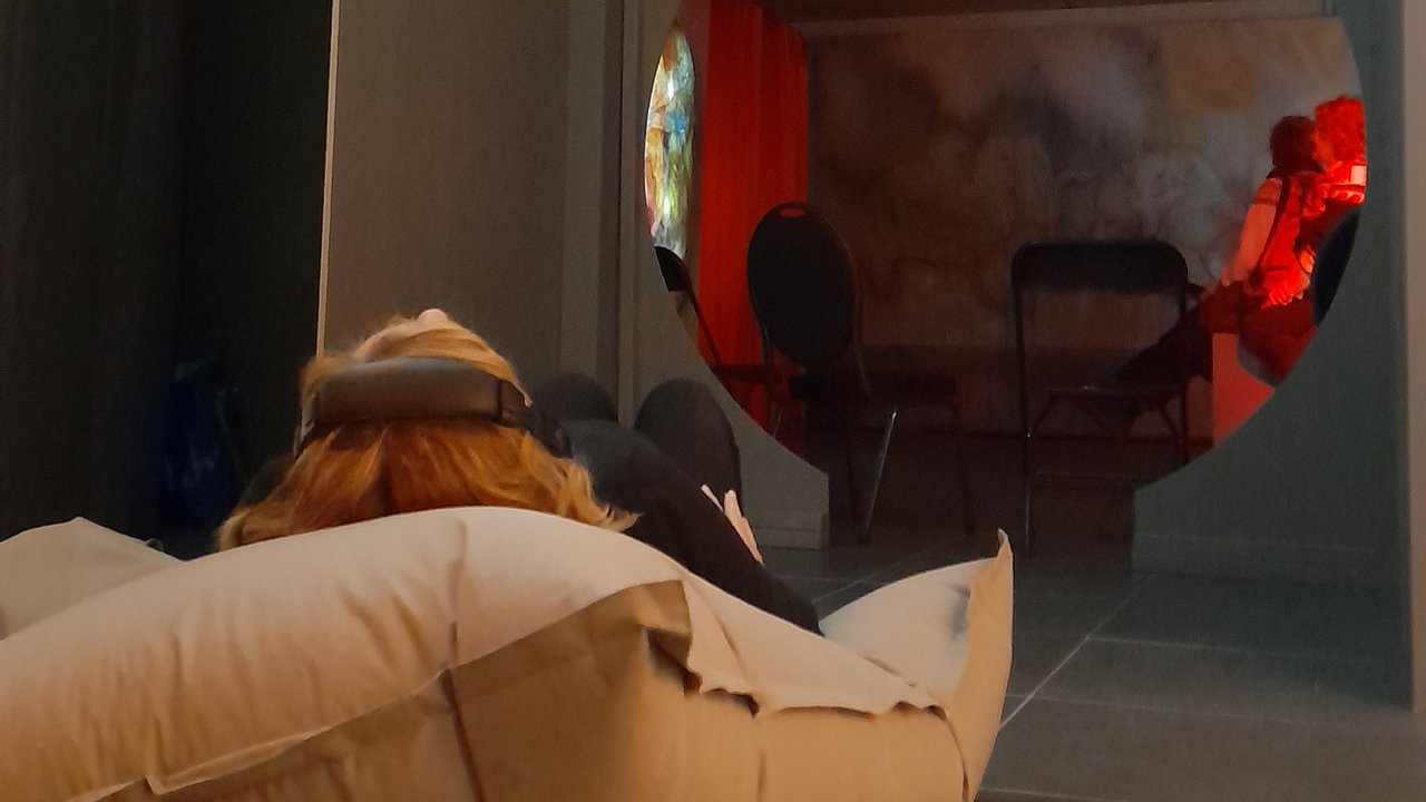 In Museum Valkenburg kun je liggend genieten van de multimediale tentoonstelling TRILOGICA van Peter Slegers. Hiervoor is een deel van de expositieruimte ingericht met speciale ligzakken, een projectie op de plafond en koptelefoons voor de muzikale beleving. Je zou bijna je ogen dicht doen, zo ontspannend is het, maar dan mis je wel een belangrijk deel van de expositie.